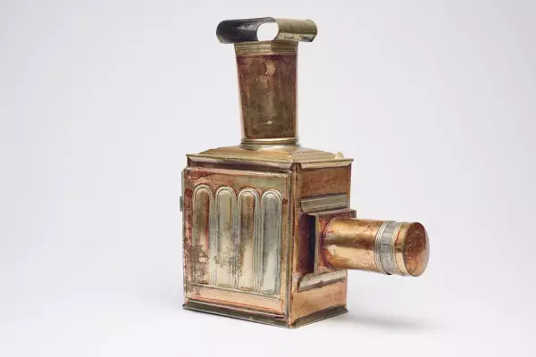 På slutten av 1700-tallet ble Laterna magica en relativt vanlig form for underholdning for de høyere sosiale lag, mens den senere på 1800-tallet hadde sin storhetstid, og på midten av 1800-tallet ble det også mulig å se fotografier på glassplatene. Lampen du ser på dette bildet er fra 1860 og er laget av metall og ser ut til å ha vært malt rød. Lampen har nok vært et populært innslag, og man kan bare undres på hvilke bilder som ble tryllet frem på lerretet med akkurat dette apparatet for mange år siden.
