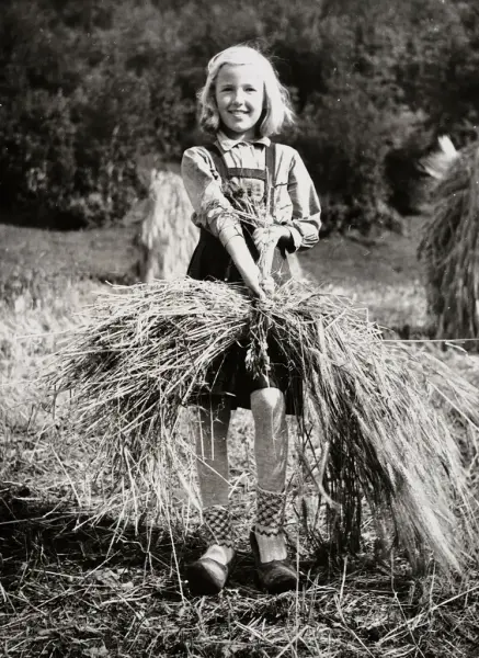 Meyer, Elisabeth, Jente med kornnek (Åsne Rui, gift Kaldråstøyl). Høsting av korn, 1943. Tilhører Preus museums samling.
