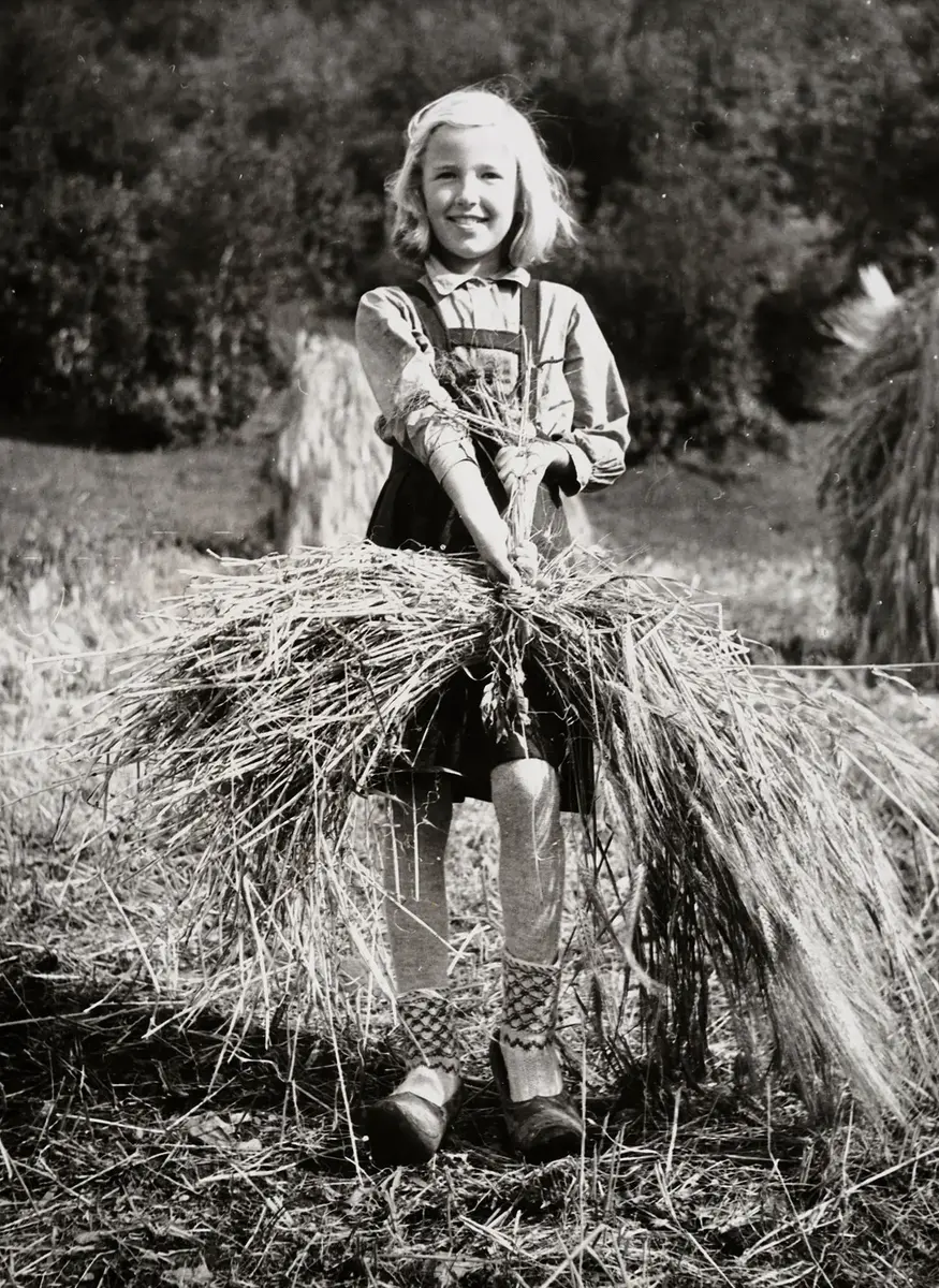 På bildet, tatt av Elisabeth Meyer, ser vi en ung jente som holder et kornnek på en gård i Rauland i Telemark i 1943. Det kan se ut som hun er et sted i nærheten av konfirmasjonsalder, og hun hjelper til sånn som alle andre under skuronna det året. Det var vanlig at hele familien var med å bidra, fra barn i konfirmasjonsalder, kanskje yngre også, til besteforeldre i 70-årene.
