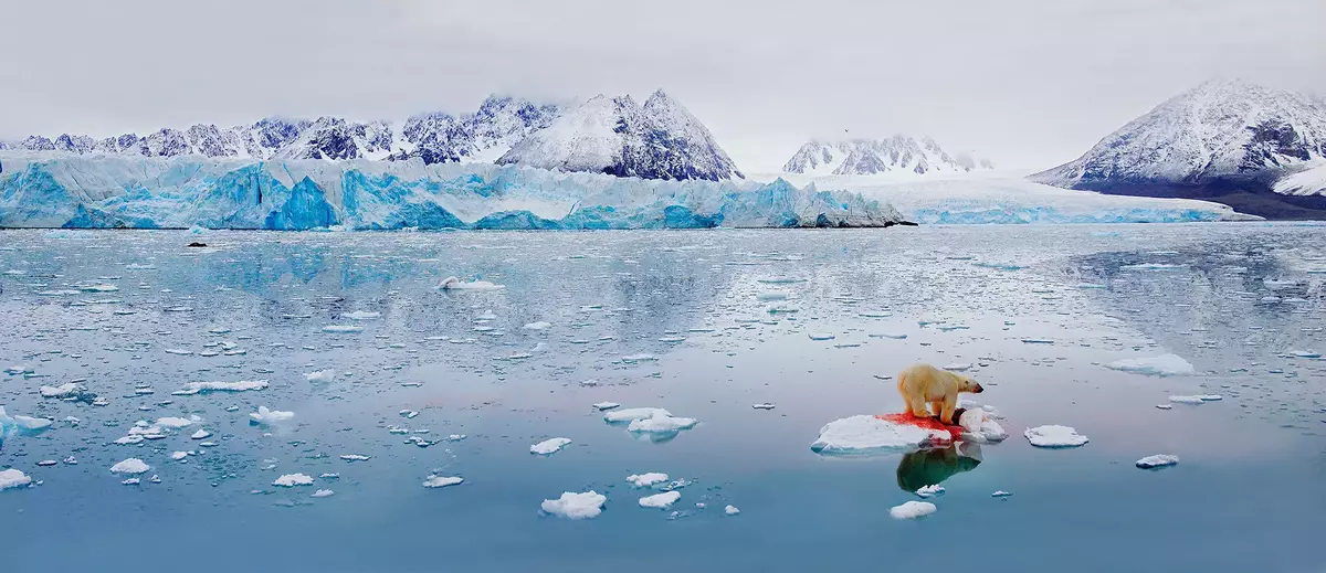 «Jeg har møtt mange isbjørner i det store, iskalde arktiske landskapet. Men denne bjørnen var i de mest fantastiske omgivelsene jeg noen gang hadde sett», sier Pål Hermansen om sitt fotografiske panorama fra Svalbard i 2005. Han fanget motivet fra et lite ekspedisjonsskip, som gled forbi bare 15 meter fra der bjørnen inntok sin frokost på et isflak.